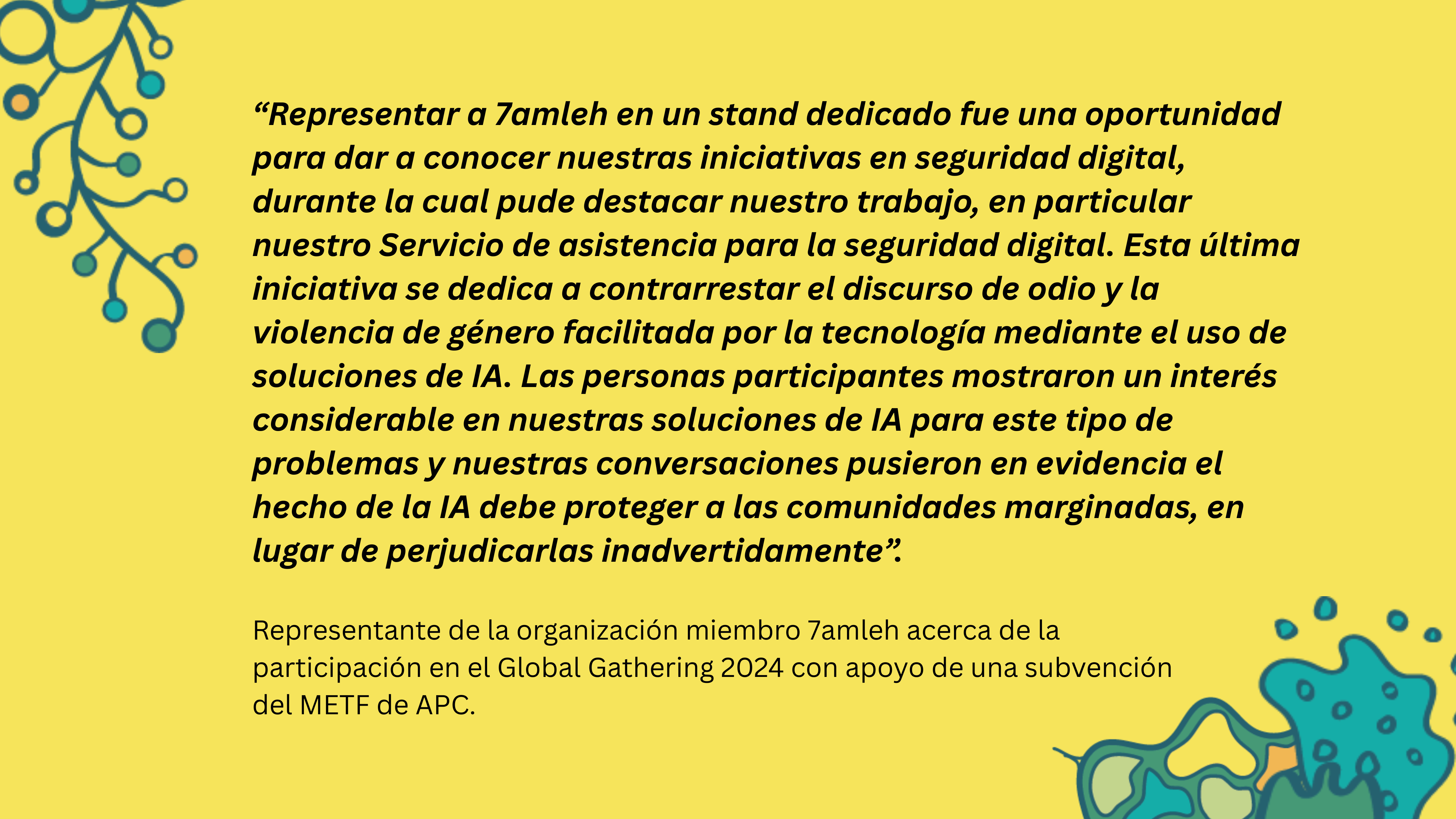 Ayudamos a crear un entendimiento común de los desafíos en materia de derechos digitales que se enfrentan en todo el mundo participando en importantes eventos regionales y mundiales. Entre ellos el Global Gathering en Portugal, la Digital Rights Asia-Pacific Assembly de 2024 (DRAPAC24) en Taipei y el Foro de AWID en Bangkok. Quince miembros pudieron participar en eventos regionales y globales claves a lo largo del año con recursos de nuestro Fondo de viaje e intercambio de miembros (METF).