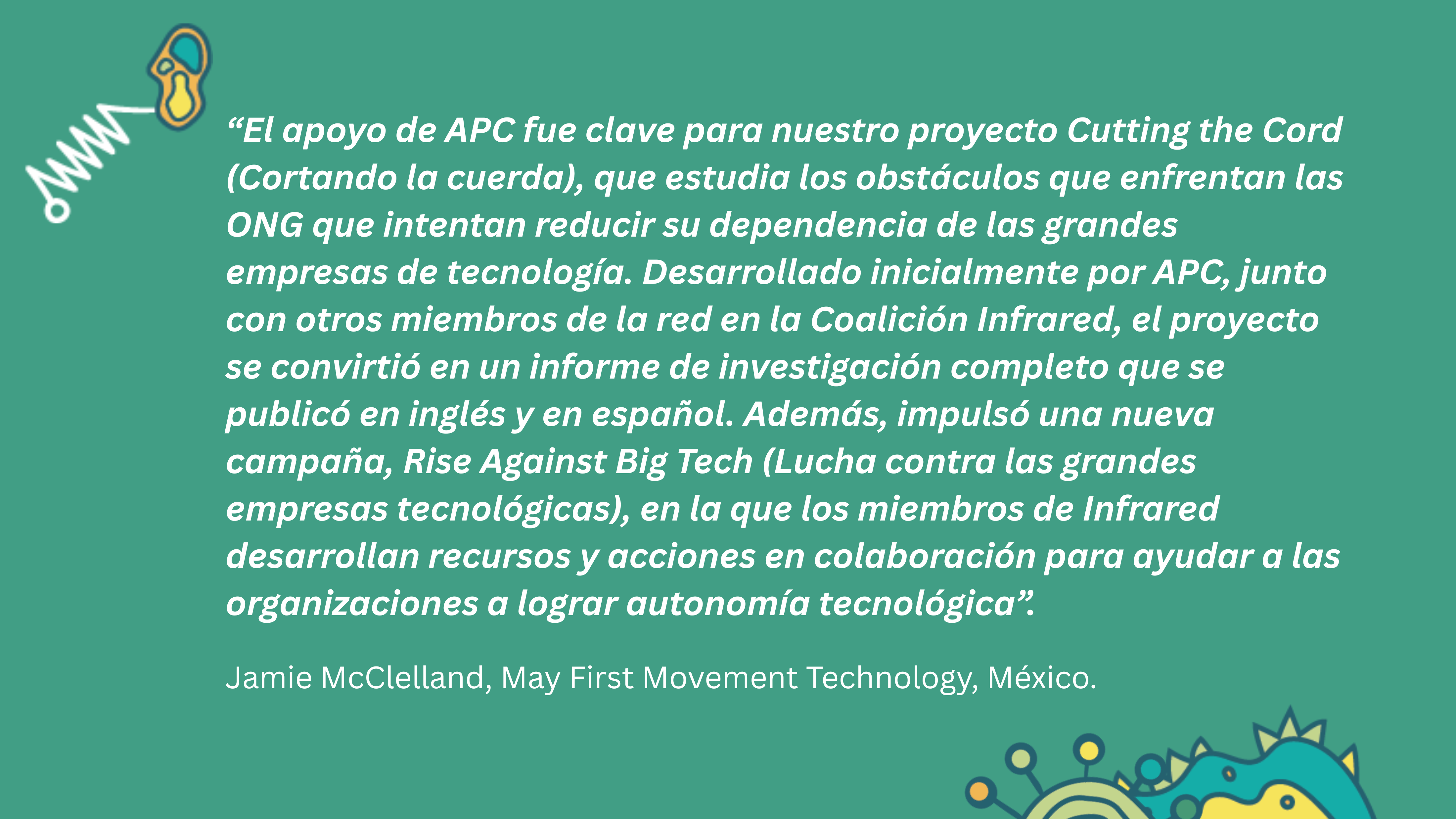 Luego de cuatro años de colaboración codiseñando encuentros de tecnología feminista, la organización filantrópica LGBTQI Astraea decidió seguir usando la infraestructura de código abierto introducida por APC. Astraea formalizó su adopción de la infraestructura y las metodologías para encuentros organizados por activistas desarrolladas durante años de colaboración con APC a través de la iniciativa CommsLabs, que prioriza el arraigo regional, el diseño participativo y las herramientas de código abierto.